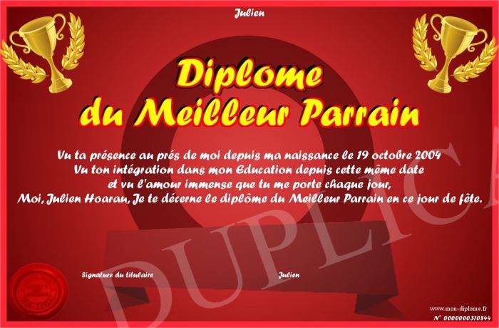 Envoyez par email votre Diplôme du Meilleur Parrain personalisé