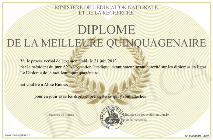 Envoyez par email votre Diplôme de la meilleure quinquagénaire personalisé