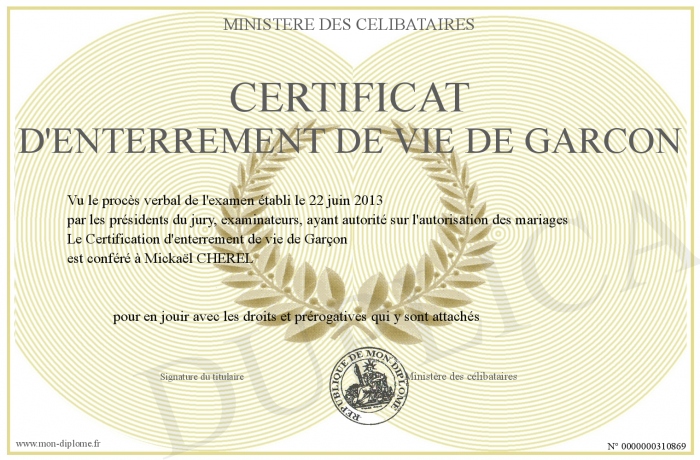 Envoyez par email votre Certificat d'enterrement de vie de garcon personalisé