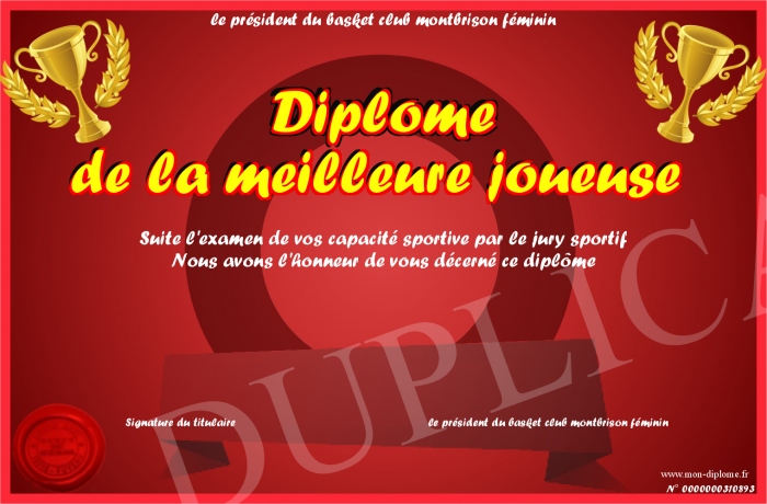 Envoyez par email votre Diplôme de la meilleure joueuse personalisé