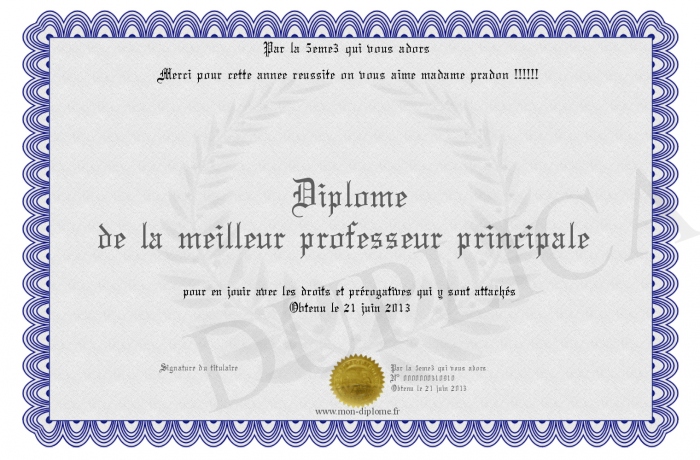 Envoyez par email votre Diplôme de la meilleur professeur principale personalisé
