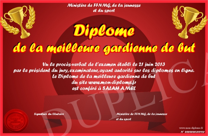 Envoyez par email votre Diplôme de la meilleure gardienne de but personalisé