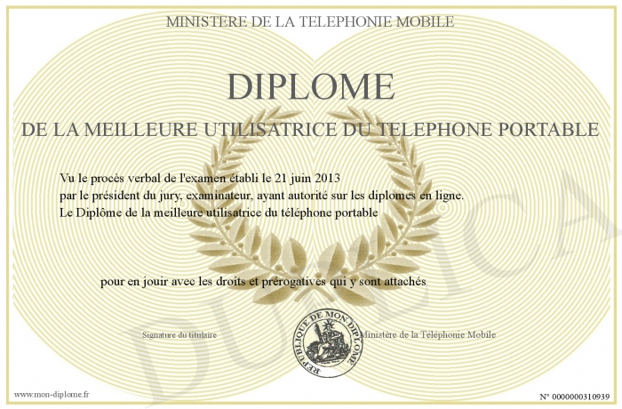 Envoyez par email votre Diplôme de la meilleure utilisatrice du téléphone portable personalisé