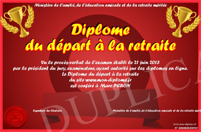 Envoyez par email votre Diplôme du départ à la retraite personalisé