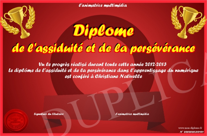 Envoyez par email votre Diplôme de l'assiduité et de la persévérance personalisé