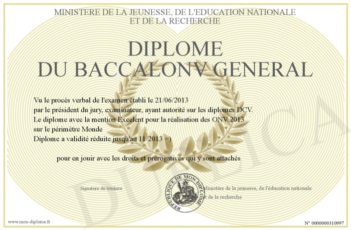 Envoyez par email votre Diplôme du baccalONV général personalisé