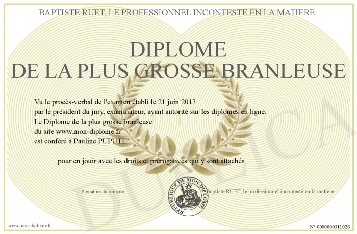 Envoyez par email votre Diplôme de la plus grosse branleuse personalisé