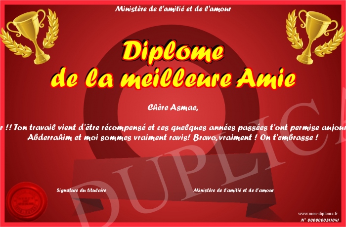 Envoyez par email votre Diplome de la meilleure Amie personalisé