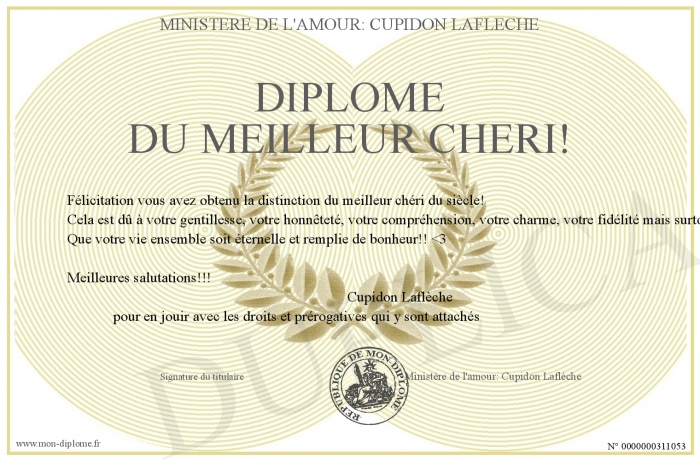 Envoyez par email votre Diplôme du Meilleur chéri! personalisé