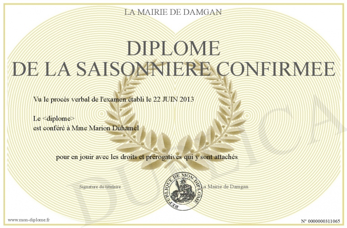 Envoyez par email votre Diplôme de la saisonnière confirmée personalisé