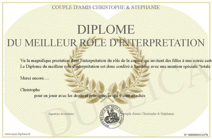 Envoyez par email votre Diplôme du meilleur rôle d'interprétation personalisé