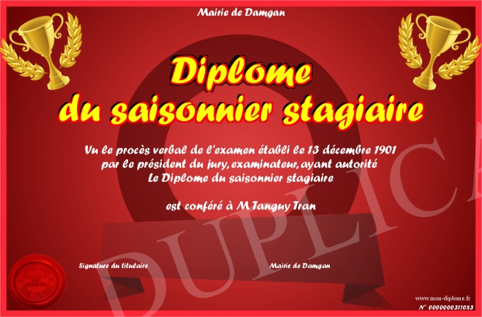 Envoyez par email votre Diplôme du saisonnier stagiaire personalisé