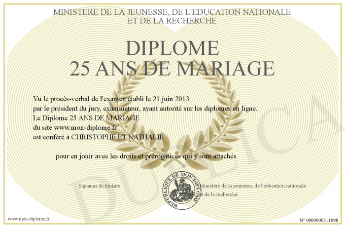 Envoyez par email votre Diplôme 25 ANS DE MARIAGE personalisé