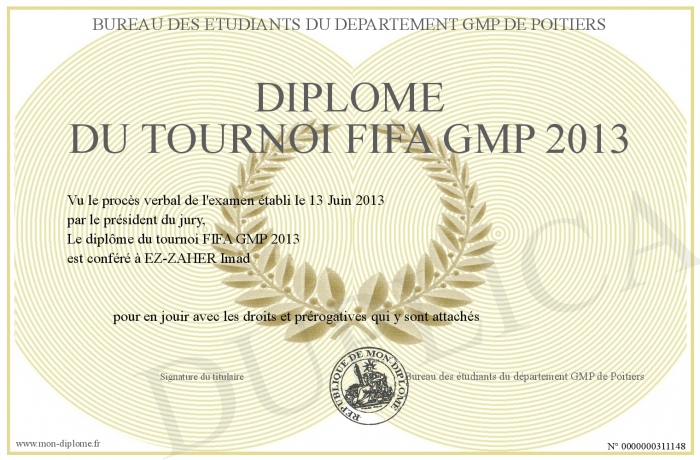 Envoyez par email votre Diplôme du tournoi FIFA GMP 2013 personalisé