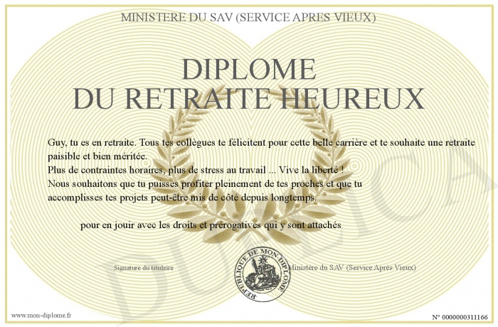 Envoyez par email votre Diplôme du retraite heureux personalisé