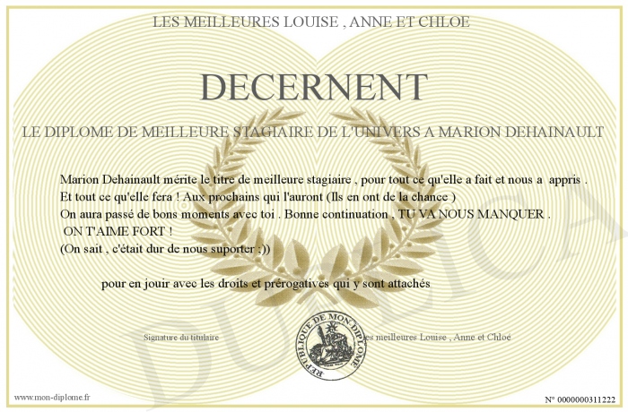 Envoyez par email votre DECERNENT LE DIPLOME DE MEILLEURE STAGIAIRE DE L'UNIVERS A MARION DEHAINAULT personalisé