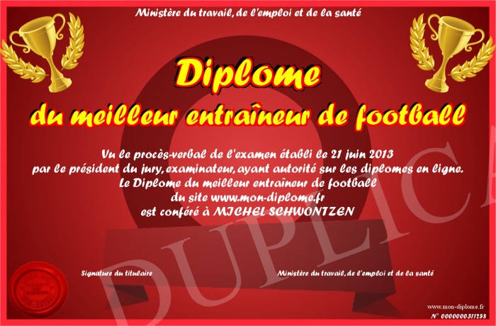 Envoyez par email votre Diplome du meilleur entraîneur de football personalisé