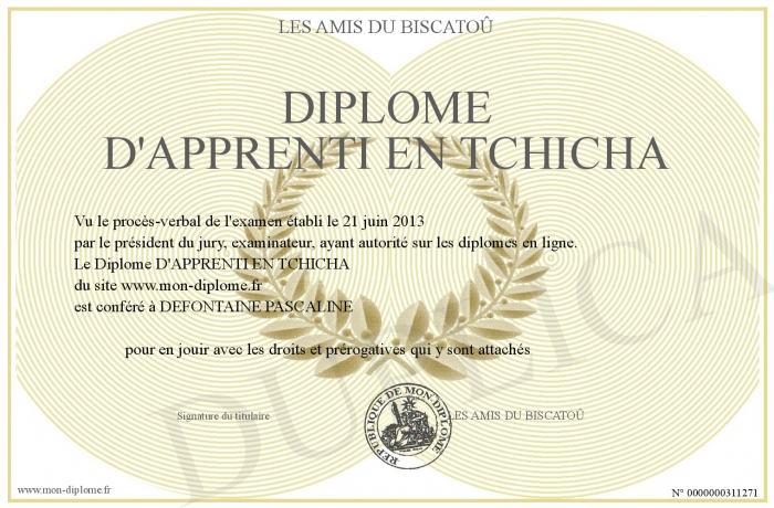 Envoyez par email votre Diplôme D'APPRENTI EN TCHICHA personalisé