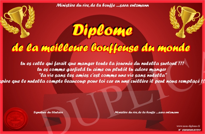 Envoyez par email votre Diplome de la meilleure bouffeuse du monde personalisé