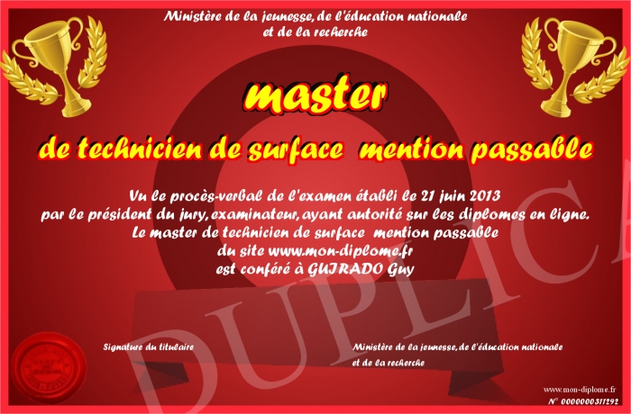Envoyez par email votre master de technicien de surface mention passable personalisé