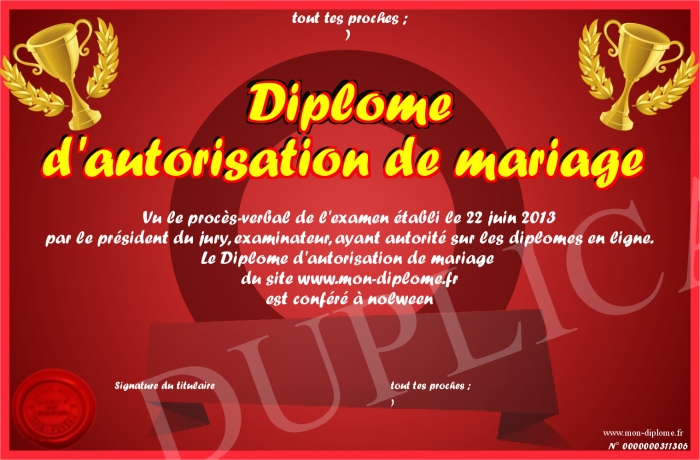 Envoyez par email votre Diplôme d'autorisation de mariage personalisé