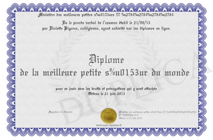 Envoyez par email votre Diplôme de la meilleure petite soeur du monde personalisé