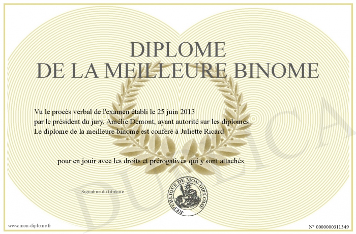 Envoyez par email votre Diplôme de la meilleure Binome personalisé