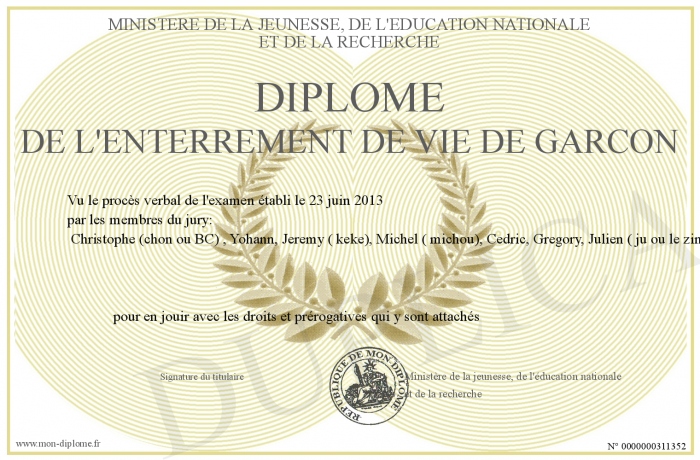 Envoyez par email votre diplome de l'enterrement de vie de garcon personalisé