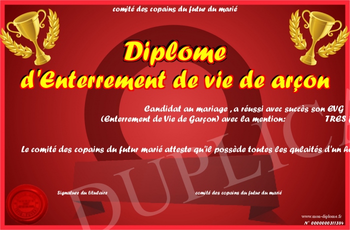 Envoyez par email votre Diplome d'Enterrement de vie de arçon personalisé