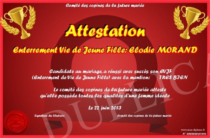 Envoyez par email votre Attestation Enterrement Vie de Jeune Fille: Elodie MORAND personalisé