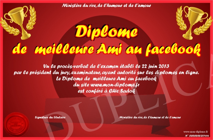 Envoyez par email votre Diplome de meilleure Ami au facebook personalisé