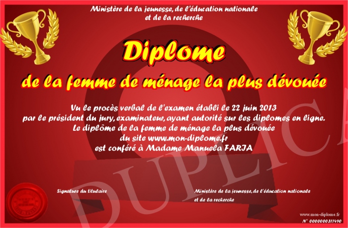 Envoyez par email votre Diplôme de la femme de ménage la plus dévouée personalisé