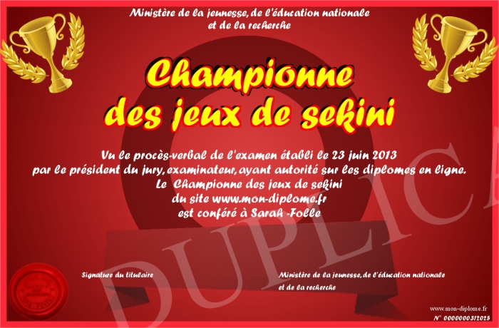 Envoyez par email votre Championne des jeux de sekini personalisé