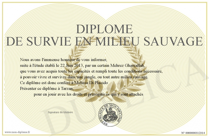 Envoyez par email votre Diplôme de survie en milieu sauvage personalisé