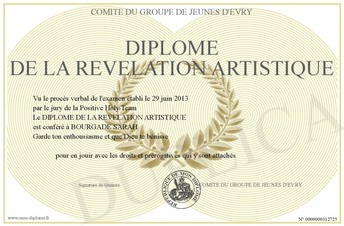 Envoyez par email votre DIPLOME DE LA REVELATION ARTISTIQUE personalisé