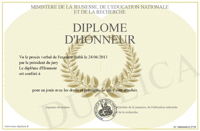 Envoyez par email votre Diplôme D'HONNEUR personalisé