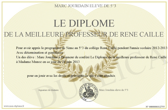 Envoyez par email votre Le Diplôme de la meilleure professeur de René Caillé personalisé