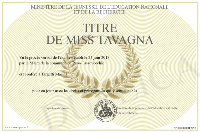 Envoyez par email votre Titre de Miss Tavagna personalisé