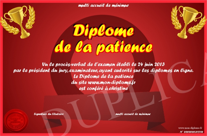Envoyez par email votre Diplôme de la patience personalisé