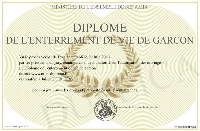 Envoyez par email votre Diplôme de l'enterrement de vie de garcon personalisé