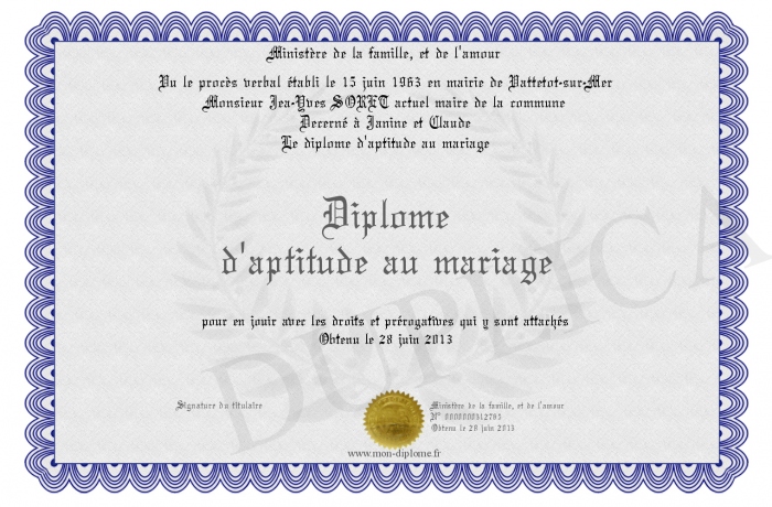 Envoyez par email votre Diplome d'aptitude au mariage personalisé