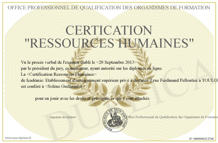 Envoyez par email votre Certication -Ressources Humaines- personalisé