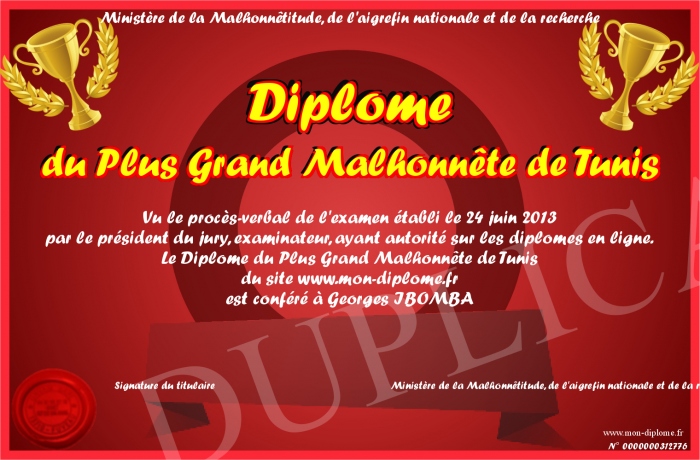 Envoyez par email votre Diplôme du Plus Grand Malhonnête de Tunis personalisé