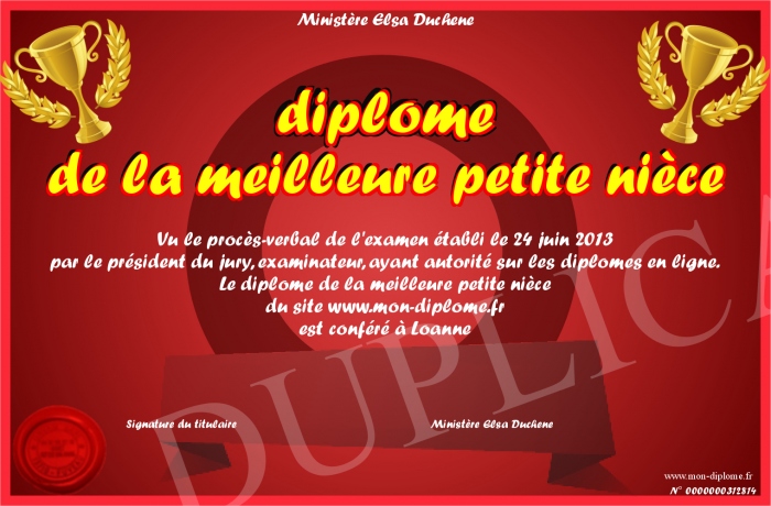 Envoyez par email votre diplome de la meilleure petite nièce personalisé