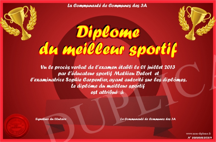 Envoyez par email votre Diplôme du meilleur sportif personalisé