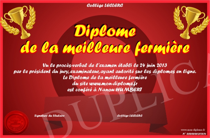 Envoyez par email votre Diplôme de la meilleure fermière personalisé