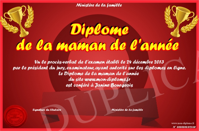 Envoyez par email votre Diplôme de la maman de l'année personalisé