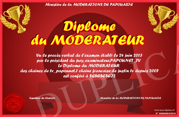 Envoyez par email votre Diplôme du MODERATEUR personalisé