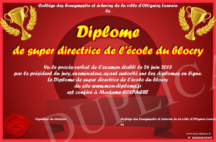 Envoyez par email votre Diplôme de super directrice de l'école du blocry personalisé