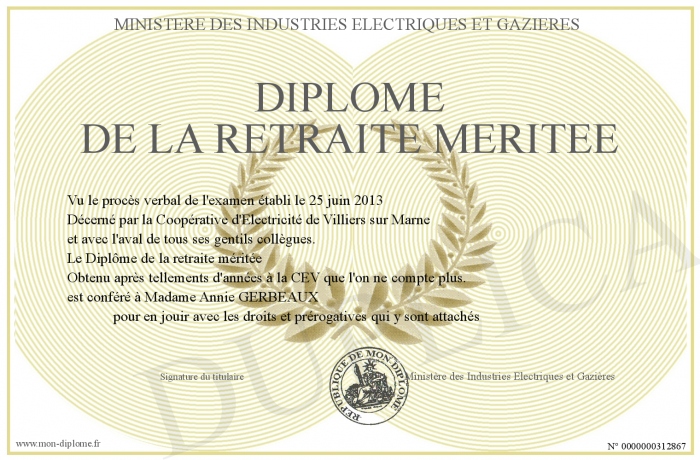 Envoyez par email votre Diplôme de la Retraite Méritée personalisé